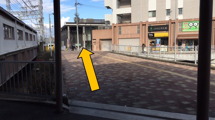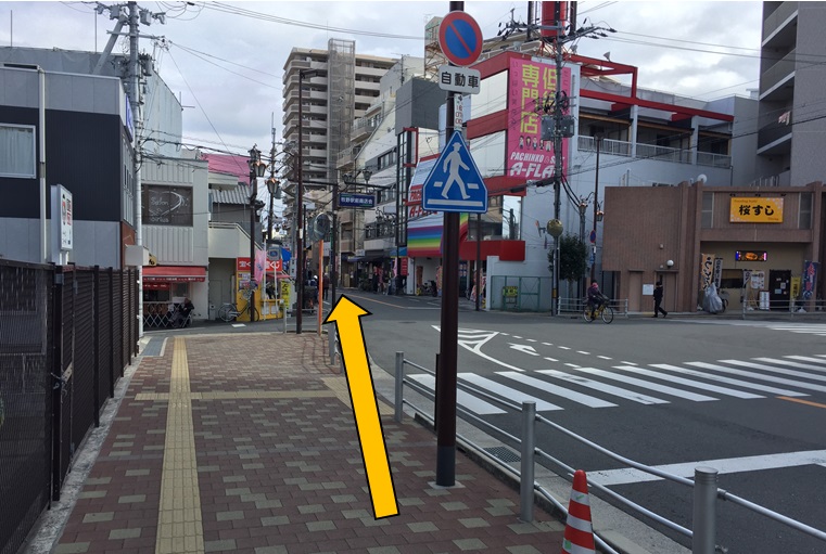 ③1番出口の階段を上がり、まっすぐ線路に沿って歩いてください。