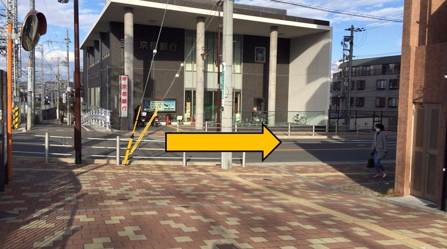 ④バス通りに突き当たるので右に曲がります。(「京都銀行」が真正面にあります。)