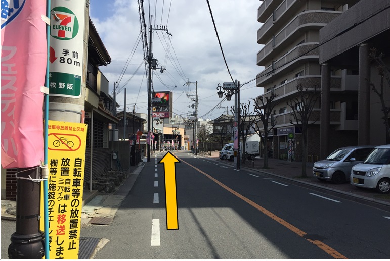 ⑥まっすぐ歩いてください。右手に「枚方信用金庫」があります。