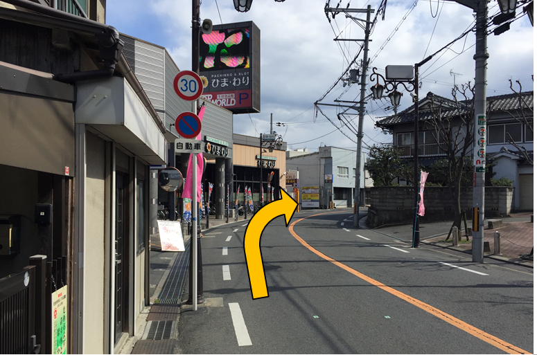 ⑦右カーブしていますが道なりに歩いてください。左手に「パチンコひまわり」があります。