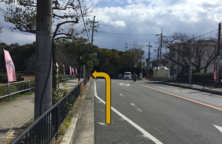 ⑧道なりに歩くと両サイドに公園があります。右手には交番があって左にカーブしています。まだ道なりに歩いて下さい。