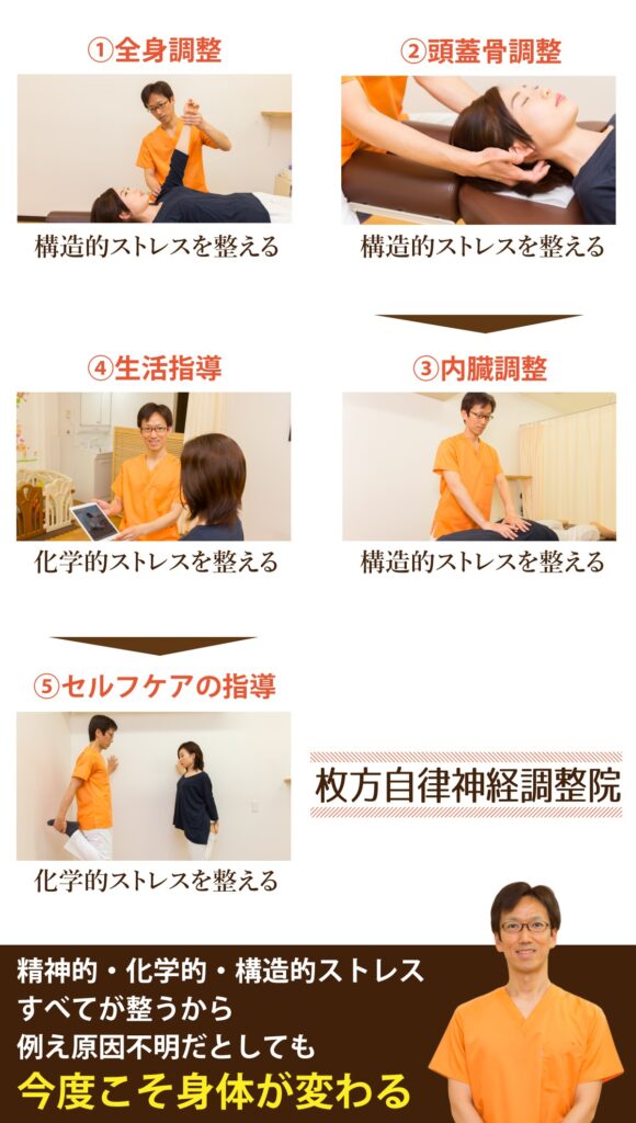 病院での検査、治療で改善されない場合はお気軽に枚方自律神経整体院にご相談ください。