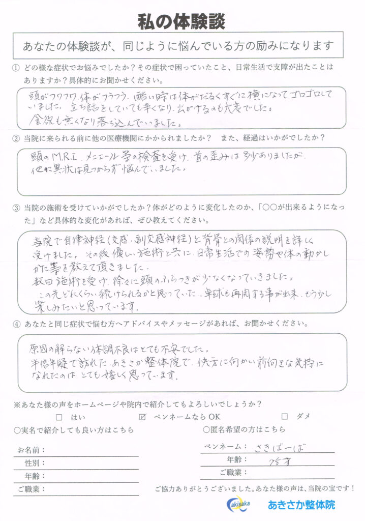 数回の施術を受け、徐々に頭のふらつきが少なくなっていきました。
