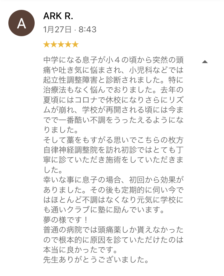 そして藁をもすがる思いでこちらの枚方自律神経調整院を訪れ初診ではとても丁寧に診ていただき施術をしていただきました。