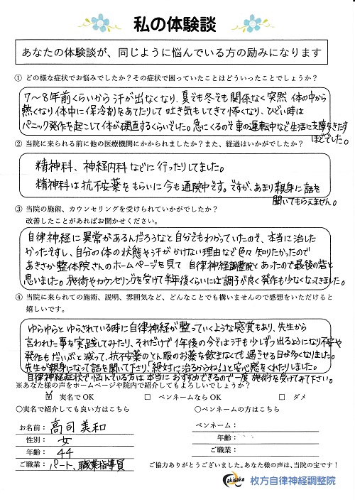 パニック発作でお悩みだった 高司美和様 44歳女性