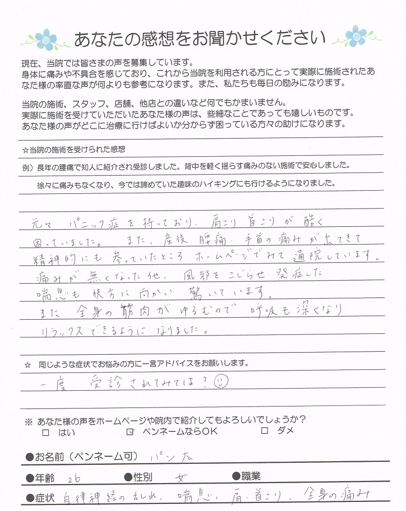 パニック・自律神経の乱れ・喘息でお悩みのパン太様 26歳女性